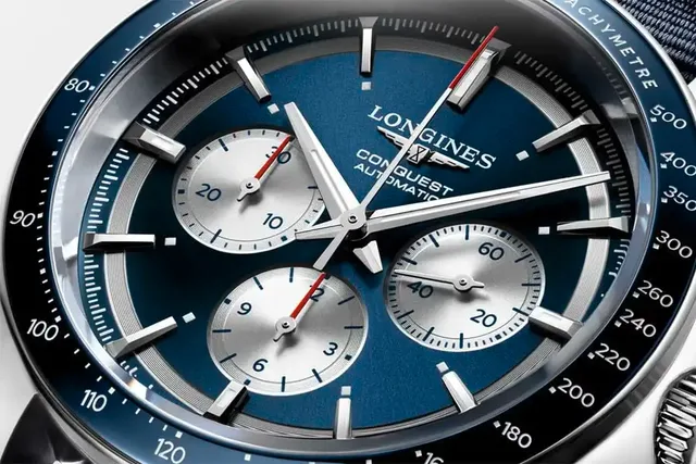 Die Conquest Marco Odermatt ist eine sportliche Edelstahluhr mit einem 42-Millimeter-Gehäuse, dessen Oberflächen abwechselnd poliert und satiniert sind. Es ist bis zehn Bar, sprich bis 100 Meter wasserdicht und wird von einer Tachymeter-Lünette mit blauer Keramik-Einlage veredelt. Unter dem beidseitig mehrfach entspiegelten Saphirglas kommt ein dazu passendes blaues Zifferblatt mit Sonnenschliff zum Vorschein, von dem sich die kleine Sekunde bei drei Uhr und die zwei weiteren silberfarbenen Chronographen-Zähler bei sechs und neun Uhr abheben. Unter den applizierten Indizes wurde das Zifferblatt mit einem azurierten Dekor versehen, das dem gesamten Design Lebendigkeit und Tiefe verleiht. Während die Zeiger der Hauptzeit und der Kleinen Sekunde silbern erscheinen, sind die der Chronographen-Funktion mit roten Akzenten versehen.