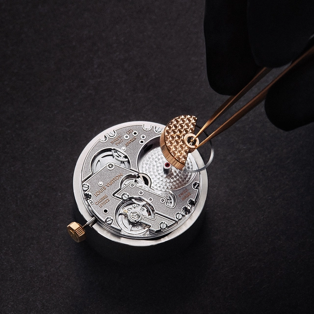 Louis VuittonDie Saphirglasböden enthüllen das automatische Kaliber LFT023, das erstmals in den Tambour-Modellen 2023 eingeführt wurde. Dieses Uhrwerk mit 147 Komponenten, entwickelt von La Fabrique du Temps in Zusammenarbeit mit Le Cercle de Horlogers, bietet eine Gangreserve von 50 Stunden und ist Chronometer-zertifiziert.