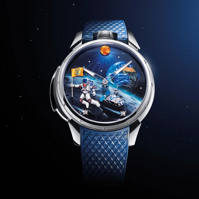 Louis VuittonJede einzelne Animation – vom schwebenden Astronauten mit der ikonischen Flagge bis zu rotierenden Satelliten – ist Ausdruck feinster Gravur- und Emaillierkunst. Techniken wie Grand Feu, Grisaille, Paillonné und Miniaturemail verschmelzen auf dem Zifferblatt zu einer faszinierenden Szene kosmischer Poesie.