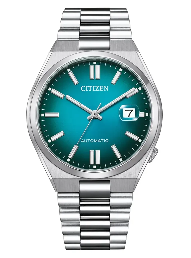 Als Motor setzt Citizen einen Veteranen, das Automatikwerk Cal. 8210, ein. Es ist durch einen Glasboden zu sehen und bringt Zeit plus Datum aufs Zifferblatt. Dieses ist nun in Hellblau (NJ0151-88M), Dunkelblau (NJ0151-88L), Türkis (NJ0151-88X) und Rot (NJ0153-82X) erhältlich. Über dem Zifferblatt spannt sich ein Saphirglas mit Vergrößerungslinse für das Datumsfenster bei der Drei.Letztere Referenz, die NJ0153-82X, kombiniert das rote Blatt mit einem IP-vergoldeten Gehäuse. Es misst wie die der anderen drei Modelle 40 Millimeter im Durchmesser und 11,7 Millimeter in der Höhe. Die Krone fügt sich bei der Vier in die Gehäusesilhouette ein. Ganz in Edelstahl kosten die drei ME NJ0151 exakt 299 Euro, die vergoldete ME NJ0153 hat einen Preis von 349 Euro. gb