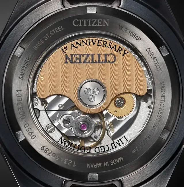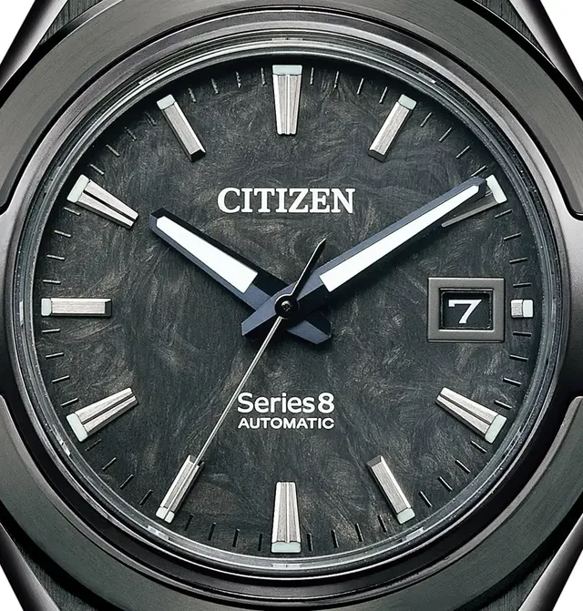 Dieses Modell in limitierter Auflage wurde anlässlich des ersten Jahrestages der Einführung der mechanischen Uhrenkollektion der Series 8 aufgelegt. Das Gehäuse mit seiner auffälligen zweiteiligen Lünette ist aus Edelstahl gefertigt und mit Duratect DLC beschichtet. Die ganz in Schwarz gehaltene Farbgebung ist von schlichter Schlichtheit mit kräftigen Zeigern und Indizes. Das Zifferblatt besteht aus leichtem und widerstandsfähigem Karbon, demselben Material, das auch in Flugzeugen und Hochleistungssportwagen verwendet wird, und eine Premiere für die Kollektion Series 8. Die schwarzen Indizes und Zeigern sorgen für einen dynamischen, sportlichen Look. Dieses Modell in limitierter Auflage weist noch weitere Besonderheiten auf: Es ist die erste Uhr der Series 8 mit einem transparenten Gehäuseboden, der den Blick auf die Bewegung der Unruh und des Rotors im Inneren freigibt.Weitere Informationen erhalten Sie unter www.citizenwatch.eu/deDie Uhr verfügt außerdem über eine verbesserte Magnetresistenz, um sicherzustellen, dass sie die genaue Zeit hält, ohne von Magnetfeldern beeinträchtigt zu werden, die von Smartphones, Tablets und anderen Geräten unserer digitalen Gesellschaft erzeugt werden. Das leistungsstarke Uhrwerk im Inneren erreicht eine durchschnittliche tägliche Ganggenauigkeit von -5 bis +10 Sekunden bei einer Laufzeit von etwa 50 Stunden.