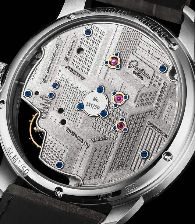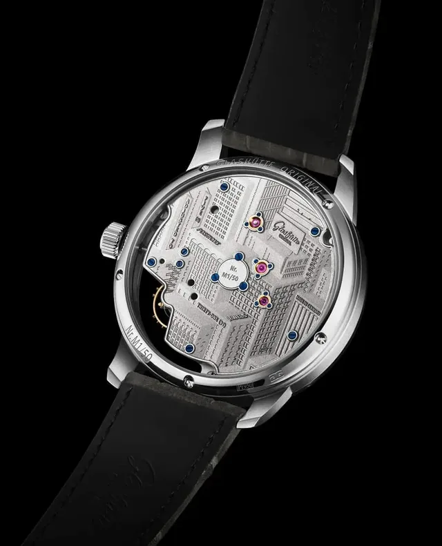 Kennzeichen der Panoinverse ist seit jeher das gedrehte Uhrwerk, das seine Dreiviertelplatine auf der Zifferblattseite zeigt. Nun erscheint eine Sonderauflage von 50 Exemplaren, die durch den Boden aus Saphirglas eine lasergravierte und schwarz rhodinierte Stadtansicht präsentiert - inklusive winzig kleiner Bewohner wie eines Graffiti-Sprayers, der am GO-Logo arbeitet.Auf der Vorderseite setzt sich das Motiv fort, tritt aber gegenüber anderen Akteuren etwas zurück: In schimmerndem Asphaltgrau hebt sich die Zeitanzeige mit kleiner Sekunde und Gangreserveanzeige hervor. Die Zeiger aus Weißgold setzen Schlaglichter. In unmittelbarer Nachbarschaft pulsiert unter der Schmetterlingsbrücke mit Duplex-Schwanenhals-Feinregulierung die Schraubenunruh.