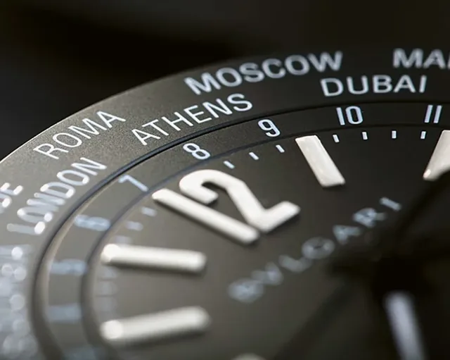Sämtliche Einstellungen werden über die kleine, aber dank ihrer Architektur sehr griffige und dadurch gut zu handhabende Krone vorgenommen: Zunächst muss die Stadt der gewünschten Zeitzone über zwölf Uhr positioniert werden. Dazu lässt sich über die mittlere Position der aufgeschraubten Krone der Städtering am Rand des Zifferblattes in beide Richtungen bewegen. Zweireihig versetzt vermerkt er – von Rom bis Samoa, von Bangkok bis New York –24 Referenzstädte für die 24 Zeitzonen der Erde, wobei die Welt von Bulgari dabei nicht zu kurz kommt. Zum Beispiel wird die Karibik nicht durch Bermuda, sondern durch St. Barts repräsentiert, eine supercoole Location, welche den Luxus in der Region und den gehobenen Anspruch von Bulgari gleichermaßen verkörpert. Zudem sind bestimmte Städte vermerkt, in denen Bulgari ein Hotel besitzt, wie Dubai oder Beijing, beziehungsweise plant zu eröffnen, wie Tokio.