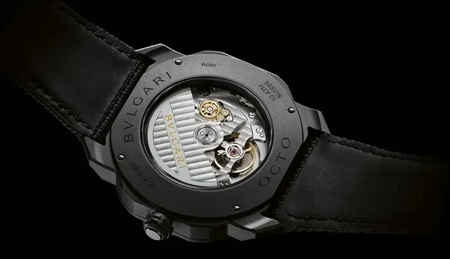 Während der mit vier glänzenden und ebenfalls schwarzen Schrauben befestigte Saphirglasboden den Blick auf das automatische Manufakturkaliber BVL257 freigibt, wird dieses inklusive seiner integrierten Weltzeitfunktion von einer doppelt gerändelten Schraubkrone aus DLC-beschichtetem Edelstahl mit Keramik-Einlagen bedient. Mit dem Schraubboden zusammen sichert das Bedienelement dem Octo Roma Worldtimer eine Druckfestigkeit von zehn Bar – rund um den Globus.
