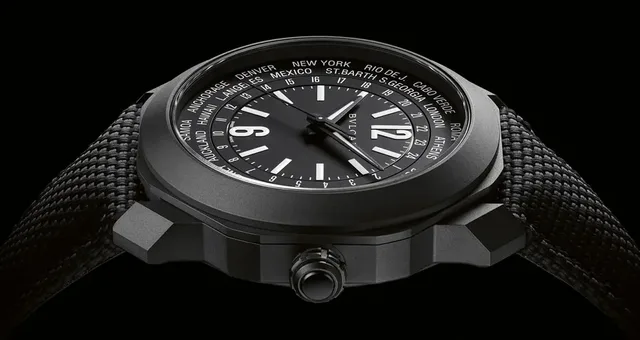 Trotz Weltzeitindikation steht die Bulgari-typische Zeitanzeige hier im wahrsten Sinne des Wortes im Mittelpunkt, nämlich im Zentrum des schwarzen sandgestrahlten Zifferblattes.