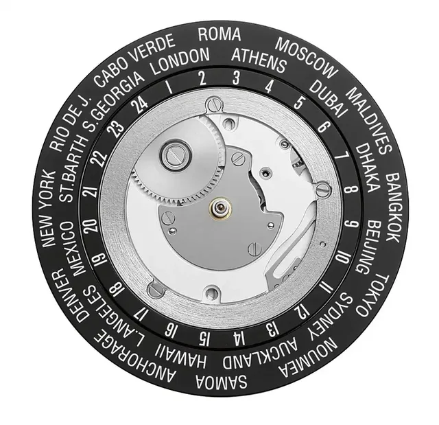 Zeitschaltung: Die Weltzeit-Indikation von der Zifferblattseite aus betrachtet.