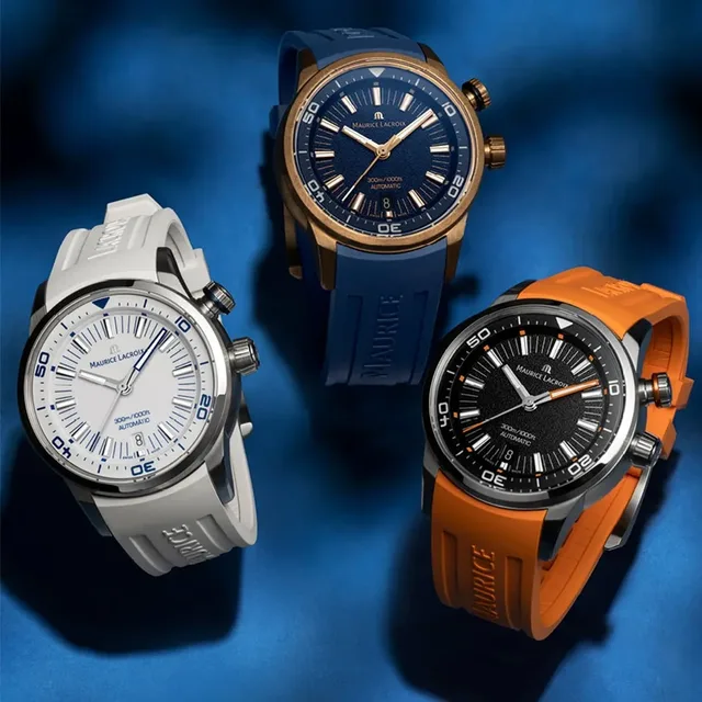 Weitere Informationen erhalten Sie unter: www.mauricelacroix.comDiese neueste Pontos S Diver wird in mehreren Varianten angeboten. Bei den Stahlmodellen steht ein schwarz gekörntes oder weiß lackiertes Zifferblatt zur Auswahl. Das auf lediglich 500 Exemplare limitierte Bronzemodell hingegen ist mit einem prächtigen, blau gekörnten Zifferblatt versehen. Die bereits erwähnte Krone bei 2 Uhr wird um einen farblich abgestimmten Ring ergänzt, der dafür sorgt, dass sie auch unter Wasser sichtbar bleibt.