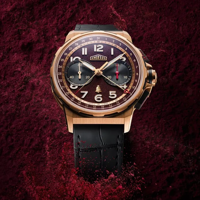 Zum ersten Mal dabei: Angelus erinnert mit seiner Einreichung für die Only Watch-Auktion daran, dass nicht nur Uhren begehrte Sammlerobjekte sind, sondern auch Weine und nutzt dabei seine Gleichnamigkeit mit Château Angelus, eines der renommiertesten Weingüter im Bordelais. Das Zifferblatt der Chronodate Gold x Château Angelus wurde aus gefriergetrockneter Weinhefe des Jahrgangs 2022 hergestellt. Dieses Weinpulver wird vorsichtig auf den Zifferblattgrund aufgetragen und sorgt damit für die entsprechende Textur und Farbe. Bei 6 Uhr wurde eine Applike aus Rotgold aufgebracht, die eine originalgetreue Gravur der Glocke des Château darstellt.In der Chronodate Gold x Château Angelus befindet sich das Kaliber A-500. Das Kaliber mit einer Frequenz von 4 Hz wird mit einem Säulenrad betrieben und hat eine Gangreserve von 60 Stunden. Das Format zeigt die kleine Sekunde bei 9 Uhr und den 30-Minuten-Chronographenzähler bei 3 Uhr. Am Rand des Zifferblattes befindet sich ein Zeigerdatum, das als Verweis auf die erste Angelus Chronodate aus dem Jahr 1942 um das Zifferblatt herum verläuft.