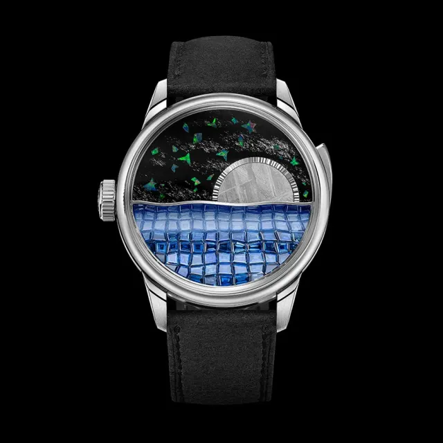 Artya wirft die erste Uhr mit einem Gehäuse aus Moissanit ins Rennen, einem extraterrestrischen Mineral, das 1893 in einem Meteoritenkrater entdeckt wurde. Moissanit ist nach Diamant das zweithärteste Material der Erde (seine Härte auf der Mohs-Härtsekala liegt zwischen 9,25 und 9,5) und lässt sich praktisch nicht bearbeiten. Dazu ist der Lichtstreuungsindex von Moissanit doppelt so hoch wie der von Diamant (0,104 gegenüber 0,044), was zu einem außergewöhnlichen changierenden Effekt führt. Das Gehäuse ist dazu mit 600 Facetten geschliffen, um das Licht weiter einzufangen. Laut Uhrenhersteller wurde das Material bisher noch nie in Uhrmacherei verwendet. Bis jetzt. Dazu kommt ein neues freigelegtes hochleistungsfähiges Kaliber mit einer 4Hz-Unruh.