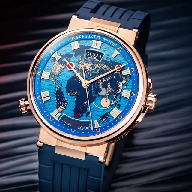 Breguet schickt ein Unikat der Marine Hora Mundi ins Rennen, ihr patentierter Mechanismus ermöglicht es, die Zeitzone mit nur einem Druck zu wechseln. Auch die Optik erinnert an die globale Zeit, das Zifferblatt mit überlagernden Ebenen zeigt eine Interpretation der Weltkarte. Zahlreiche roségoldfarbenen Punkten, die auf der Erde glänzen, sollen laut Breguet daran erinner, dass dieser Planet niemals schläft. Die Sonne und der Mond bei 4 Uhr sind für eine besonders realistische Darstellung von Hand gehämmert. Das Datum im Fenster bei 12 Uhr verfügt über einen retrograden Zeiger, der vom Kalendersystem gesteuert wird.