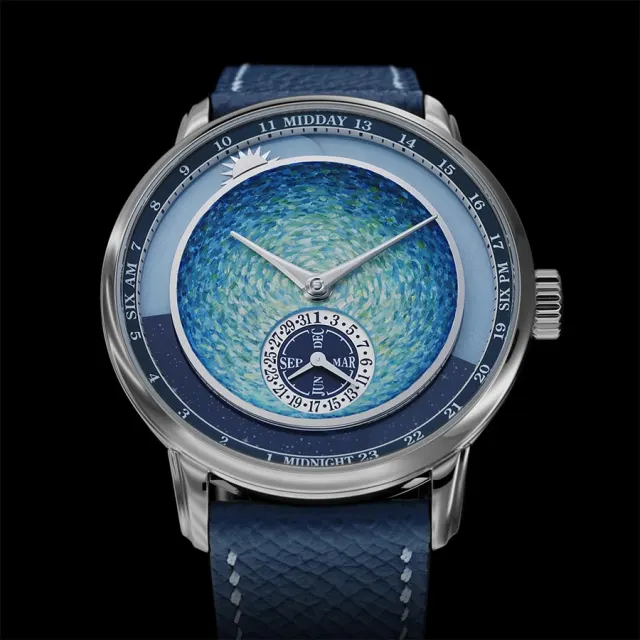Für seine Only Watch-Edition nutzt Krayon Techniken zur Miniaturmalerei und erinnert an die Kunst als Ode zur Natur. Als Fortsetzung der Anywhere Only Watch 2021 Edition ist die diesjährige Ausführung in Blautönen gehalten, die die Anzeige von Sonnenauf- und -untergängen überall auf der Welt, nachahmen.Das 39 mm-große Gehäuse aus Titan Grad 5 beherbergt die Anzeigen der Stunden und Minuten mit zwei Zeigern. Es ist von einer ringförmigen Anzeige umgeben, auf der sich eine kleine Sonne in ständiger Bewegung befindet, die die Zeit über 24 Stunden anzeigt. Die ringförmige Zone besteht aus zwei Sektoren: einem Tagsektor (azurblau) und einem Nachtsektor (dunkelblau), deren jeweilige Bogenlänge die Zeit des Sonnenauf- und -untergangs angibt, die auf der Rückwand abgelesen werden kann.Um den geografischen Faktor einzubeziehen, hat Krayon ein mechanisches Positionierungssystem entwickelt. Das Datum und der Monat wird auf einem Hilfszifferblatt bei 6 Uhr angezeigt. Die Anywhere Only Watch 2023 von Krayon wird durch das Kaliber C030 zum Leben erweckt, welches von Rémi Maillat, dem Gründer von Krayon, in Neuchatel (Schweiz) vollständig gefertigt wurde.