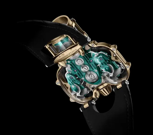 MB&F: Unterseite der HM9 Sapphire Vision in Gelbgold mit grünem Werk