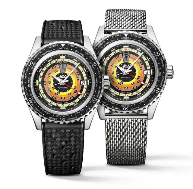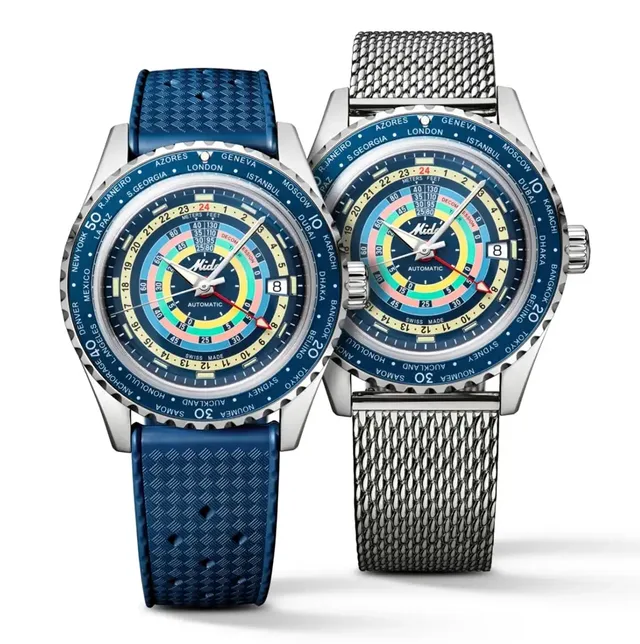 Mido erweitert sein Wassersportuhren-Angebot: Der Ocean Star Decompression Worldtimer folgt mit seinem bunt skalierten Zifferblatt Midos Skin Diver Watch aus den 1960er-Jahren.