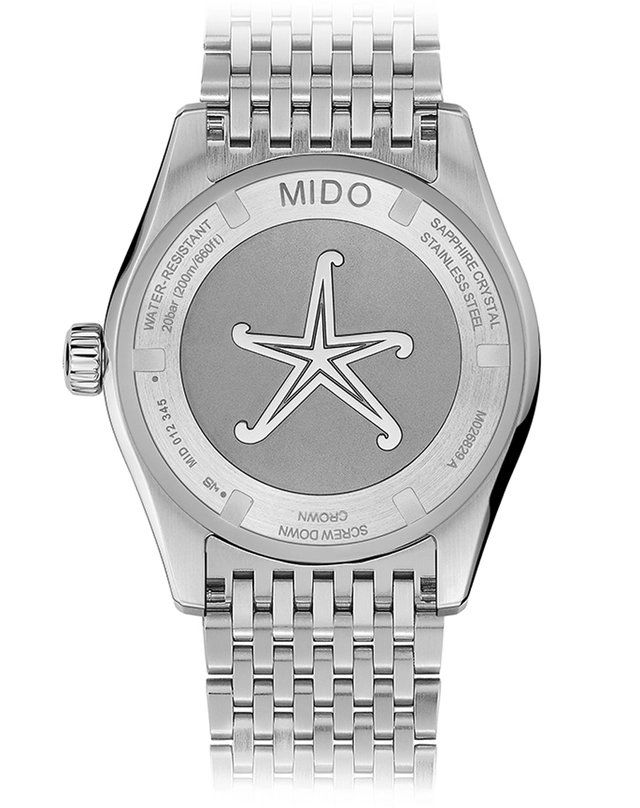 Hinter dem massiven Vollgewindeboden mit Seesternrelief arbeitet das Eta-Automatikkaliber C07.661 mit 80 Stunden Gangreserve und magnetfeldresistenter Nivachron-Spirale, das bei Mido Kaliber 80 heißt. Es ist bis 20 Bar Druck vor Wassereinbruch geschützt.