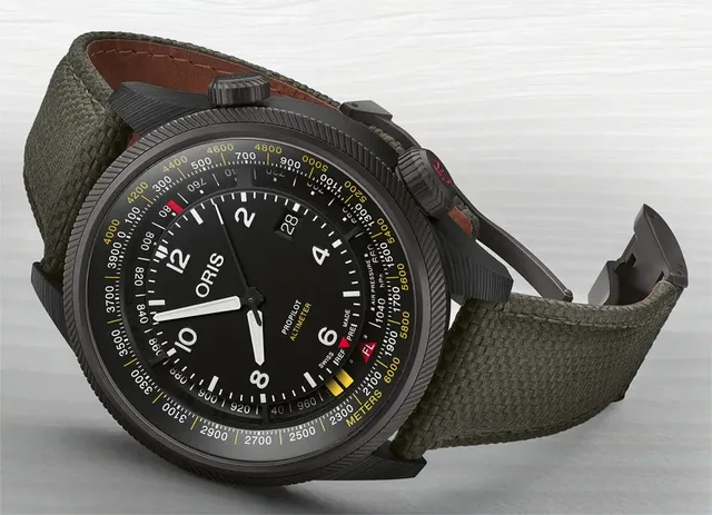Einen Höhenmesser ist freilich in jedem Cockpit vorhanden, aber im Sinne der doppelten Sicherheit - oder für Retrofans - ist diese Funktion dennoch interessant: Oris bietet seit Langem das Modell Big Crown ProPilot Altimeter mit barometrischemHöhenmesser an, hat diese Uhr aber 2023 funktionaler, flacher und leichter gemacht: Sie misst nun bis 6.000 statt 4.500 Meter (bzw. auf der optional wählbaren angloamerikanischen Skala 19.700 Fuß) und baut mit einer Höhe von 16,7 Millimetern einen Millimeter flacher, was vor allem daran liegt, dass nun das Sellita-Automatikkaliber SW 300 statt des SW 200 verwendet wird. Dadurch ist auch die Gangreserve von 38 auf 56 Stunden angewachsen. Highlight der 47 Millimeter großen Fliegeruhr ist aber das Gehäuse aus Carbon: Es wird in einem neuartigen Verfahren im 3D-Druck aus Kohlenstofffasern und PEKK-Verbundmaterial erstellt. Das neue Material zeigt nicht nur selbstbewusst sein Schichtdesign durch zahlreiche Linien, sondern bewirkt auch eine Gewichtsreduktion von 168 auf nur noch 98 Gramm. Der Preis der Neuheit beträgt 6.200 Euro.Mehr zu der Uhr erfahren Sie in unserer Testreportage.