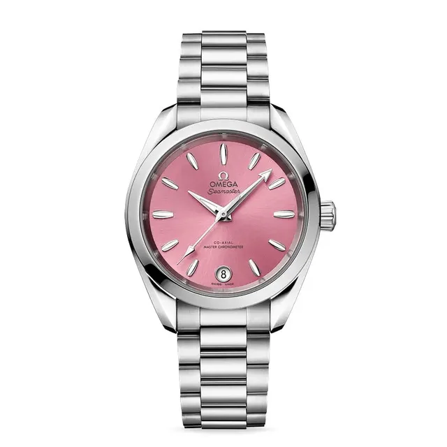 Etwas geerdeter kommt die Omega Seamaster Aqua Terra Shades Co‑Axial Master Chronometer in 34 mm daher. Die Stahlreferenz 220.10.34.20.10.003 hat ein laut Hersteller muschelrosafarbenes Zifferblatt aus Messing mit einem Sonnenschliff. Bei 6 Uhr befindet sich ein Datumsfenster, die Zeiger, Indizes sowie das Logo sind aus diamantpoliertem 18 K Weißgold gefertigt. Angetrieben wird die Uhr vom Co-Axial Master Chronometer Kaliber 8800. Der Zeitmesser ist für 7.000 Euro erhältlich.