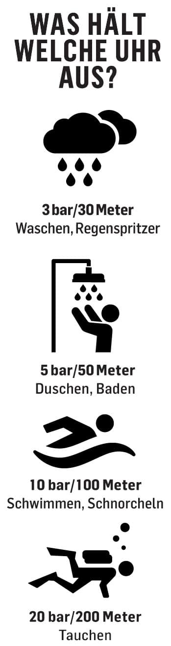 Nicht mit jeder Uhr können Sie Tauchen gehen. Was welche Angabe zur Wasserdichtheit bedeutet, zeigt das Bild.