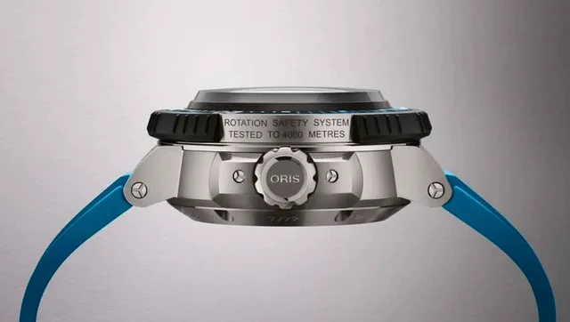 Für die hohe Wasserdichtheit bis 4.000 Meter sorgt neben einer verschraubten Krone und einem extradicken Saphirglas ein stämmiger Titanboden. Den Platz rund um das Markenlogo nutzt Oris für eine kreisförmige Skala zur Umrechnung von Fuß in Meter. Diese reicht logischerweise bis zur Maximaltauchtiefe der Uhr.