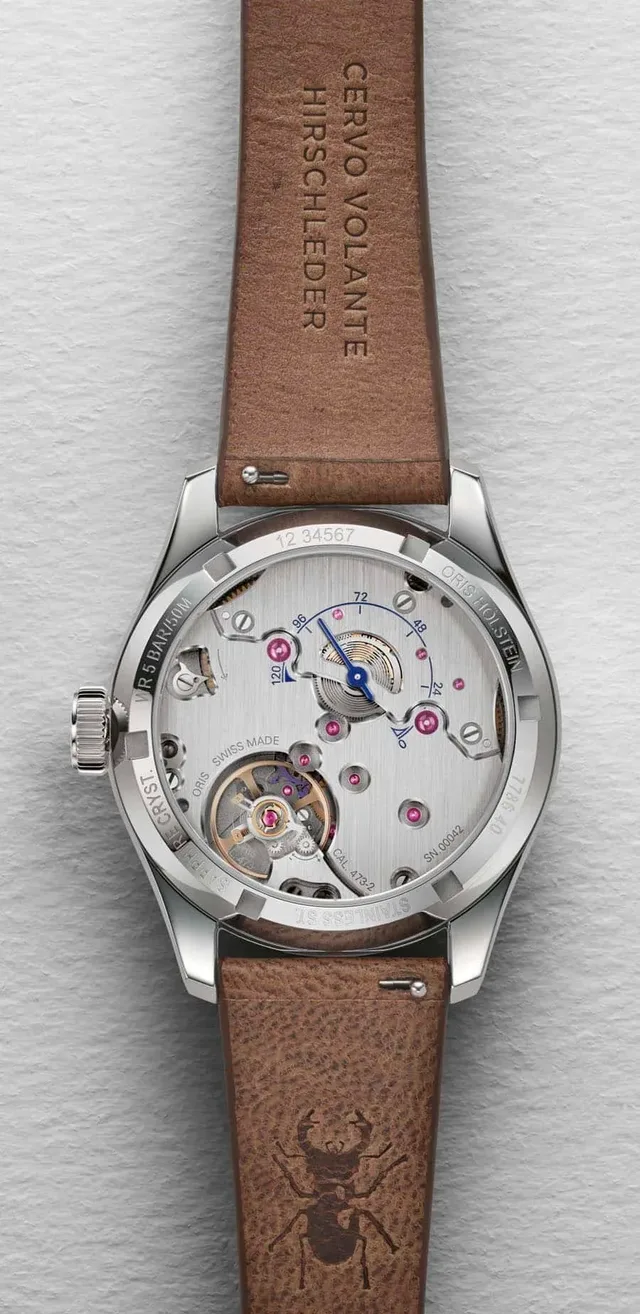 Die Uhr mit dem für Oris typischen "Pointer Date" und der kleinen Sekunde besitzt wie das Vorbild von 1938 ein Handaufzugswerk. Auf der Rückseite hat Oris für das 5-Tage-Werk eine Gangreserveanzeige integriert. Für die spezielle Konstruktion mit einem innovativen Rad, dass die sonstige Friktionslösung überflüssig macht, hat die Schweizer Marke ein Patent angemeldet.