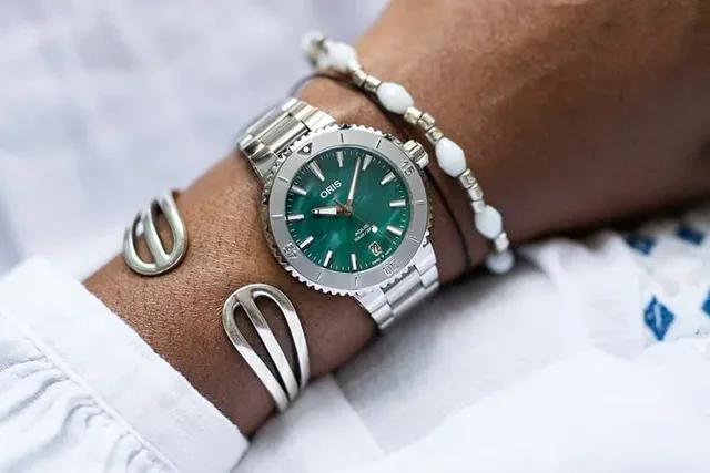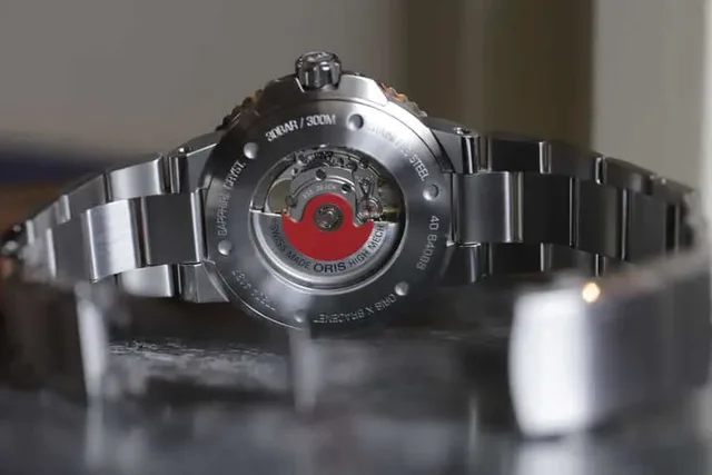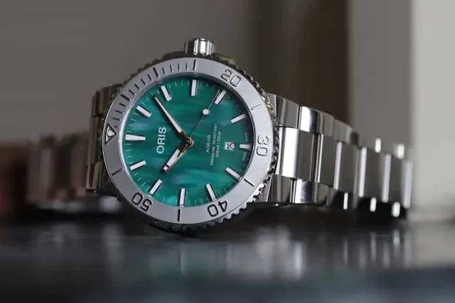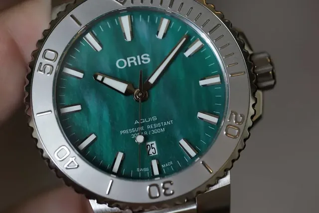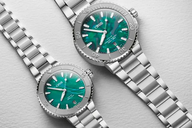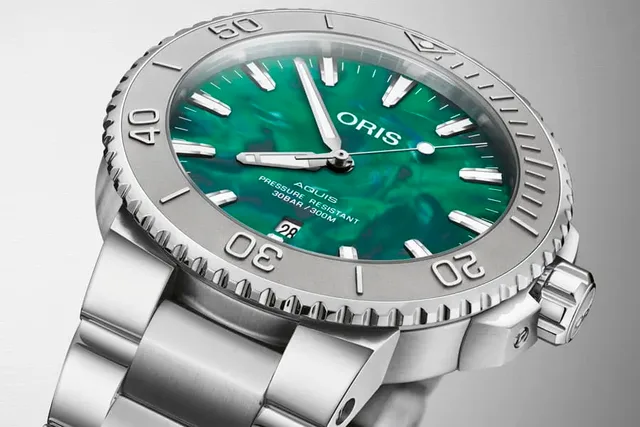 Eingebracht wird es zusammen mit dem automatischen Oris-Kaliber 733 auf Sellita-Basis in zwei Edelstahlgehäuse von 43,0 und 36,5 Millimetern Durchmesser. Mit einseitig drehbaren Lünetten, verschraubten Kronen und Böden sowie einer Druckfestigkeit bis 30 Bar haben sie entsprechend der Aquis-Mentalität Taucheruhr-Qualitäten. Hinter gewölbten und entspiegelten Saphirgläsern kommen Stunden, Minuten und Sekunden aus der Mitte und ein Datum bei sechs Uhr zur Anzeige. Dank Superluminova auf Index-Appliken und Zeigern ist die Zeit auch beim Tauchen oder schlechten Lichtverhältnissen gut ablesbar. Auf dem verschraubten Edelstahlboden mit Mineralglas-Einsatz gibt es spezielle Gravuren, unter anderem Oris X Bracenet. Wichtig ist Oris dabei die Symbolik für den Wandel, die man erkennen soll.