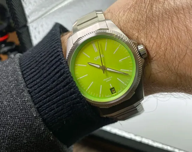Oris stellt eine Kermit gewidmete Version seiner ProPilot X Calibre 400 vor. Zum einen strahlt das Zifferblatt in der grünen Froschfarbe des Muppets, zum anderen wird jeder 1. eines Monats zum Kermit-Day, denn dann lacht dem Träger die Figur aus dem Datumsfenster an, soll ihm ein Lächeln aufs Gesicht zaubern und ihn daran erinnern, nicht alles so ernst zu nehmen.