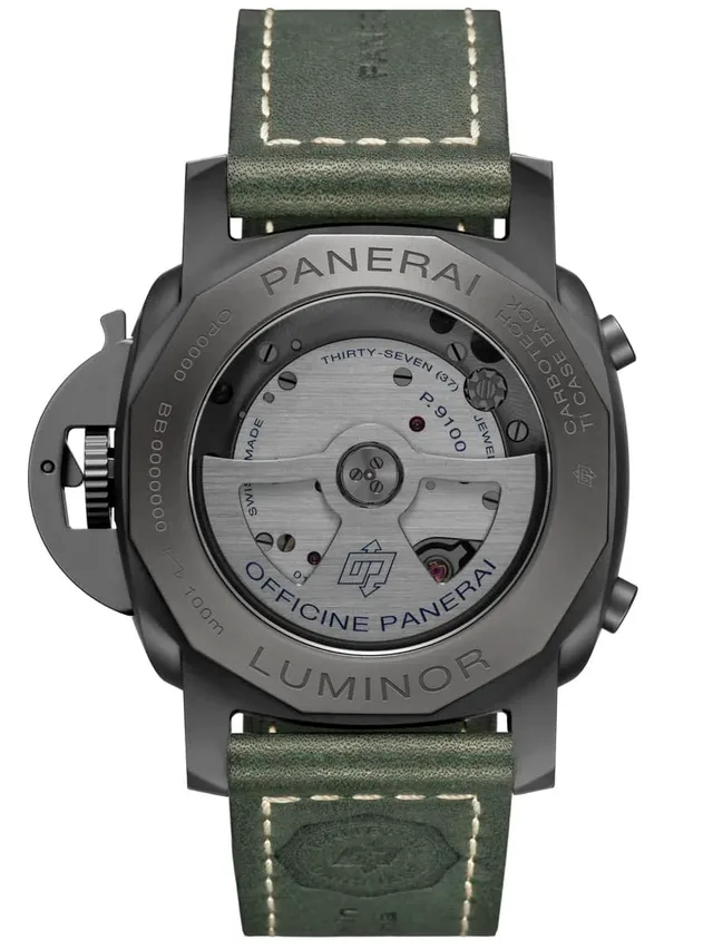 Das Automatikkaliber P.9100 besitzt die Panerai-typische großflächige Brücke und eine Gangreserve von drei Tagen