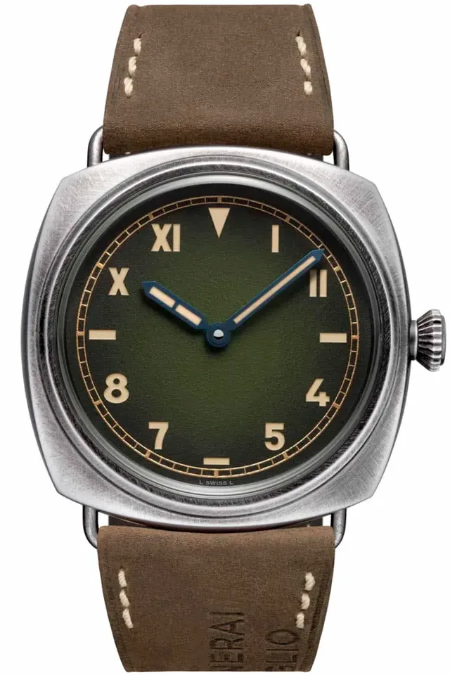 Das Modell ist die erste 45 Millimeter große Uhr mit dem California-Dial, bei dem eine Hälfte des Zifferblatts mit römischen, die andere Hälfte mit arabischen Ziffern ausgestattet ist. Das Zifferblatt ist bei der Neuheit in einem dunklen Grün gehalten. Die beigefarbene Superluminova leuchtet im Dunkeln ebenfalls grün.Das Gehäuse besteht aus eSteel, ein Edelstahl, der aus bis zu 95 Prozent recyceltem Stahlschrott gewonnen wird und dessen Herstellung die CO2-Emissionen erheblich reduzieren soll. Zudem wurde dem Gehäuse durch PVD-Beschichtung und Handbürstung ein verwitterter Effekt verliehen.Im Innern der bis 10 Bar wasserdichten Uhr verbaut Panerai das Manufakturkaliber P.5000 mit achttägiger Gangreserve. Das Handaufzugswerk treibt die gebläuten Zeiger an. Auf dem Armband findet sich der eingebrannte Schriftzug „G. Panerai e Figlio“. Ein exklusives Detail, das die Inschrift auf dem Schild der ursprünglichen Panerai Werkstatt in Florenz wiedergibt. Die Retrouhr ist zum Preis von 12.500 Euro zu haben. jk