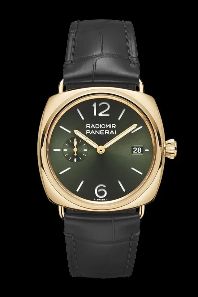 Panerai Radiomir Quaranta mit einem Gehäuse aus Gelbgold und einem grünen Sonnenschliff-Zifferblatt