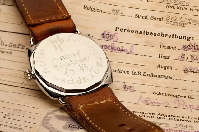 Die Gravur des Gehäusebodens gibt Auskunft über den Zeitraum, in dem die „Einsatzgruppe Keller“ ihre Einsätze durchführte. Auch die Initialen des Erstbesitzers Heinz Pape („HP“) sind erkennbar. Foto: Jörg Wischmann