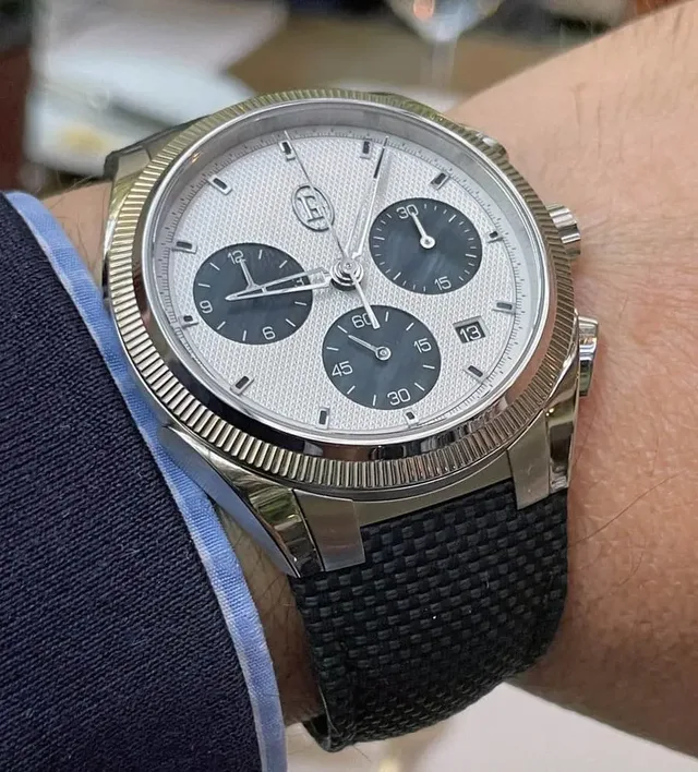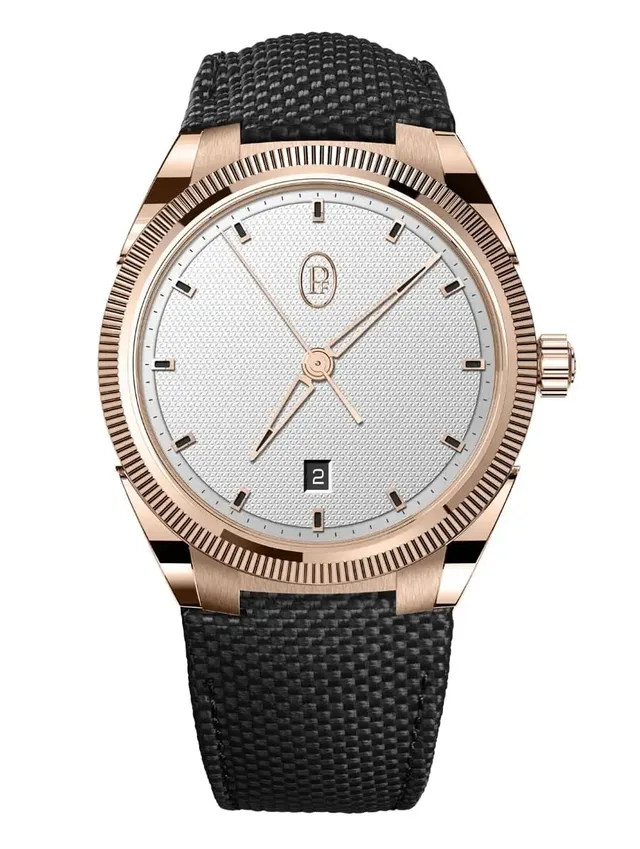 Und so gibt es auch einige Parallelen zur klassischen Tonda-Kollektion wie die Gehäuse- und Zeigerform.Die feinen Details machen den Unterschied bei Parmigiani. So ist die Lünette nicht ganz so fein gerändelt wie bei der regulären Tonda PF-Kollektion: 160 Einkerbungen statt 225. Und das Zifferblatt trägt statt der Grain-d’Orge-Guillochierung ein erhabenes Clou-triangulaire -Muster. Weitere Besonderheit ist das von Hand genähte Kautschukarmband mit Cordura-Beschichtung. Das Datum und Leuchtmasse und Hilfszifferblätter den Chronographen sind in kontrastierendem Schwarz gehalten.