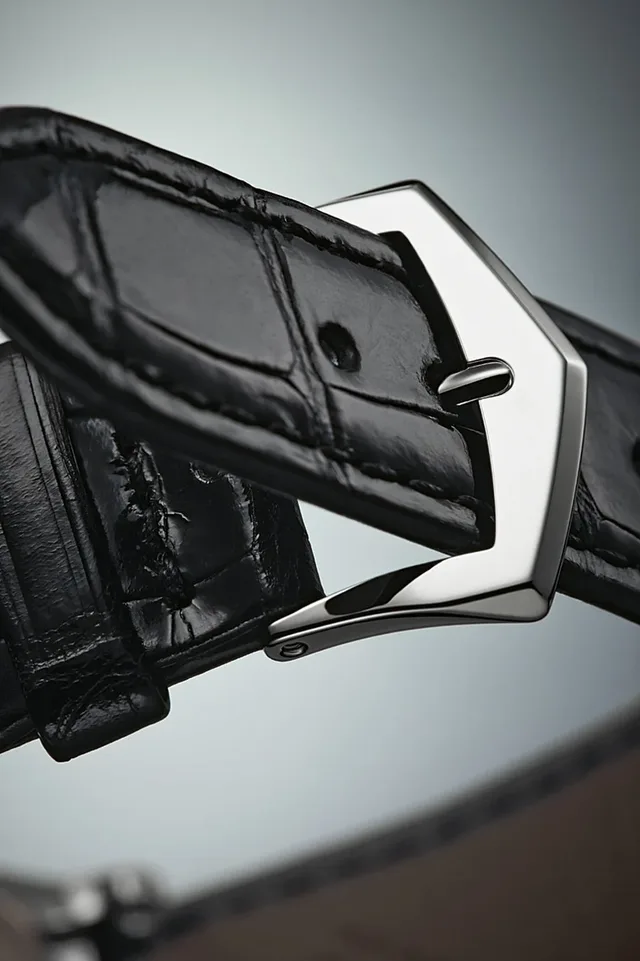 Weitere Design-Nuancen sind von manch anderem Modellen inspiriert: Die aufgesetzten und mehrfach facettierten Obelisk-artigen Stundenindizes, einschließlich dem Doppelindex bei zwölf Uhr, führen zum Beispiel bis zu den Wurzeln des Calatrava-Designs und den Referenzen 96 von 1932 und 96D von 1934 zurück. Auch die mit drei Facetten versehenen Stunden- und Minutenzeiger in Dauphine-Form erinnern an die Referenz 96. Und nicht zuletzt führen die gebogenen Bandanstöße, die zwischenzeitlich mehrmals verworfen und wieder aufgegriffen wurden, ebenfalls bis ganz zu den Anfängen zurück. Nach dem Vorbild der ersten Calatrava schaffen sie einen ergonomisch perfekten Übergang vom Gehäuse zum Armband und sorgen für hohen Tragkomfort. Die weißgoldene Calatrava 6119G-001 wird an einem schwarz glänzenden Alligator-Lederband mit Weißgold-Dornschließe getragen. Deren charakteristische Form wurde vom ehemaligen Präsidenten Henri Stern, dem Großvater des aktuellen Präsidenten Thierry Stern, für den amerikanischen Markt entworfen.