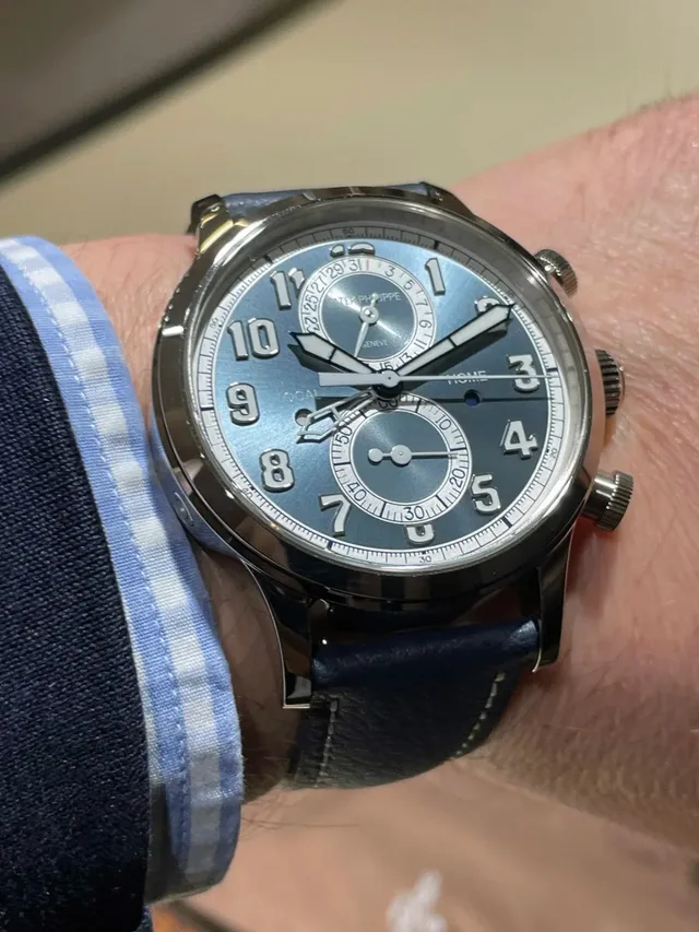 Wristshot der Patek Philippe Calatrava Pilot Travel Time Chronograph in Blau
