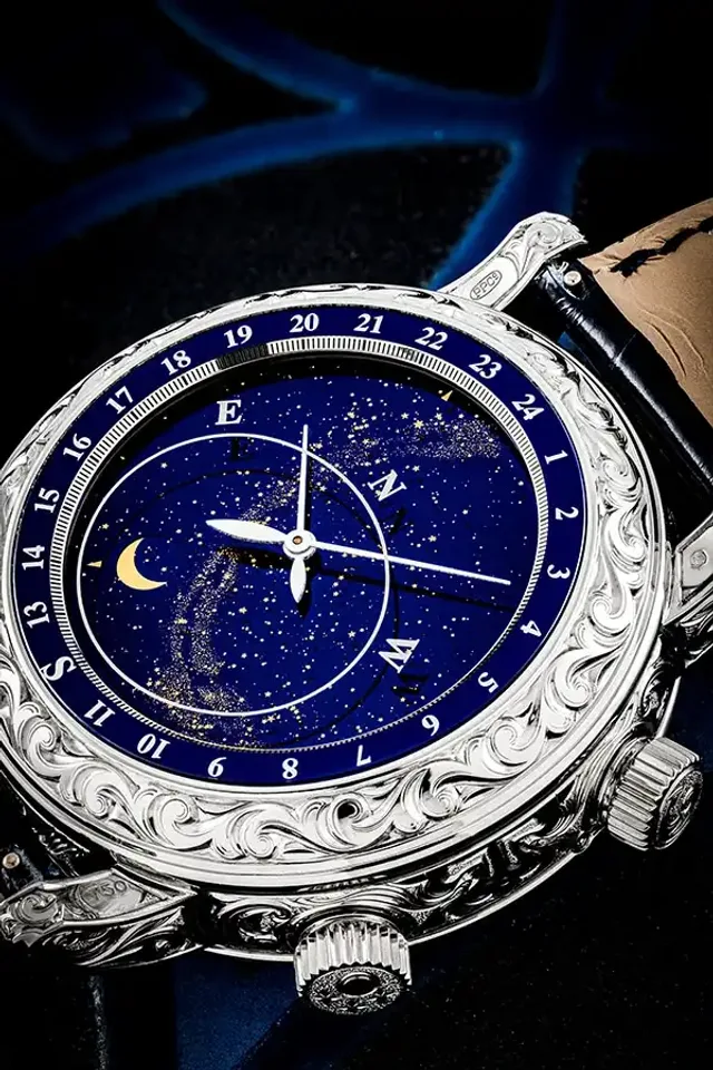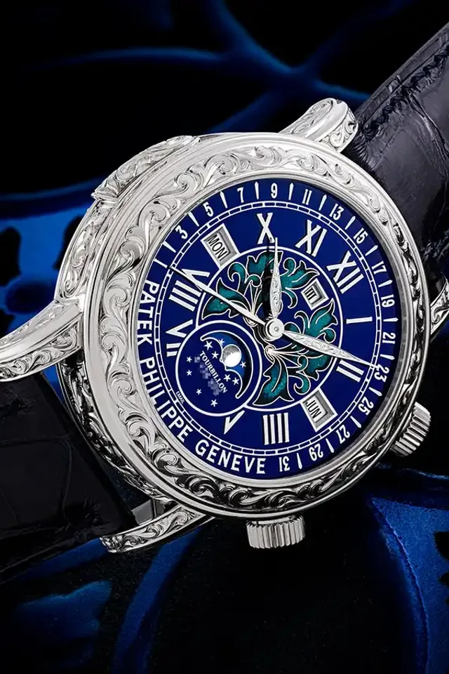 Ursprünglich im Jahr 2015 im Patek Philippe Salon in Genf lanciert, ist die "Sky Moon Tourbillon" Teil der Grand Complications-Serie von Patek Philippe und zählt über 12 Komplikationen wie Kathedralen-Minutenrepetition, Tourbillon, ewiger Kalender, rückläufiges Datum, Mondphasen, Schaltjahranzeige, Sternzeit, Himmelskarte sowie Phasen und Umlaufbahn des Mondes. Das blaue Cloisonné- und Champlevé- Emailzifferblatt ist von einem 18-karätigen Weißgoldgehäuse mit Gravuren umgeben. An der Verzierung sitzen die Kunsthandwerker über 100 Stunden.