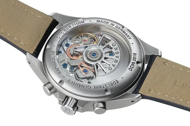 Mit dieser neuen Modelllinie schafft DAMASKO den Spagat zwischen einem eleganten Sportler und einem klassischen Chronographen. Das Gehäuse aus gehärteten Instrumentenstahl erstrahlt in einem Wechselspiel aus polierten und perlgestrahlten Flächen im neuen Glanz. Dennoch immer mit Fokus auf Langlebigkeit, Robustheit und einem gewissen instrumentellen Charakter. Das Herzstück der Zeitmesser ist das Manufakturkaliber C51-6 in TOP Ausführung. Ausgestattet mit veredelten Oberflächen, skelettiertem DAMASKO-Rotor und gleichzeitig optimiert durch ein Silizium Ankerrad für verlässliche Gangergebnisse. Alles gut sichtbar durch den Saphirglasboden.