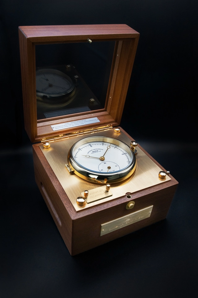 Das Mahagoni-Gehäuse hat mit 185 x 185 Millimetern die klassischen Maße eines Marinechronometer.