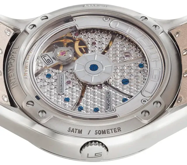 Zur hochwertig ausgestatteten Kollektion gehört die 42 Millimeter große Intemporal Dual Time – eine Zeitzonenuhr mit deutschem Chronometerzertifikat und hoher Gangdauer von 60 Stunden. Das automatische Manufakturkaliber LS0006 mit Automatikaufzug und Chronometerzertifikat bietet selbst gefertigte Werkbrücken mit einzigartigen Oberflächenverzierungen sowie einen transparenten Saphirglasrotor, der mit seinem außen liegenden Metallelement niemals den Blick auf die besondere Mechanik verstellt.