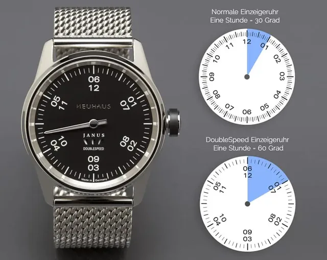 Seit 2010 baut Manuel Neuhaus in Augsburg nicht nur Einzeigeruhren, die ohnehin schon eine uhrmacherische Spezialität darstellen: Zudem lässt er den einsamen Stundenzeiger auch noch mit doppelter Geschwindigkeit rotieren, sodass er bei einer Umdrehung lediglich sechs statt zwölf Stunden anzeigt. Diese gewagte Lösung hört sich erst einmal nach einer weiteren Verkomplizierung an, hat aber den Vorteil, dass jede Stunde in einem größeren Segment dargestellt wird und sich somit komfortabler und genauer ablesen lässt. Das Konzept ist weltweit einmalig und geschützt.