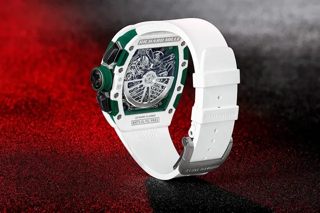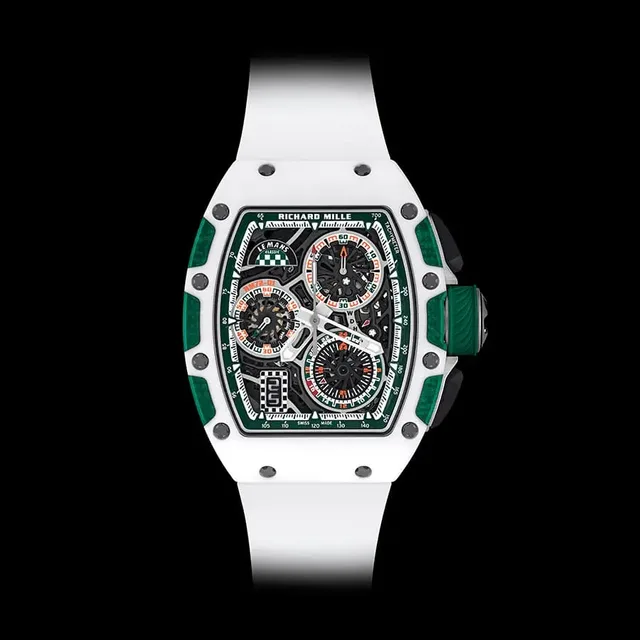 Auch Richard Mille ist eng mit dem Motorsport verbunden, seit 2008 hat sich der Uhrenhersteller für jede Ausgabe des Events spezielle Uhren in den Farben der Veranstaltung überlegt. Die diesjährige Edition bildet keine Ausnahme, die RM 72-01 Le Mans Classic ist auf 150 Exemplare limitiert. Die RM 72-01 LMC harmoniert in einer Kombination aus grünem und weißem Quartz TPT, die Gehäusemaße messen 38,40 x 47,34 x 11,68 mm.