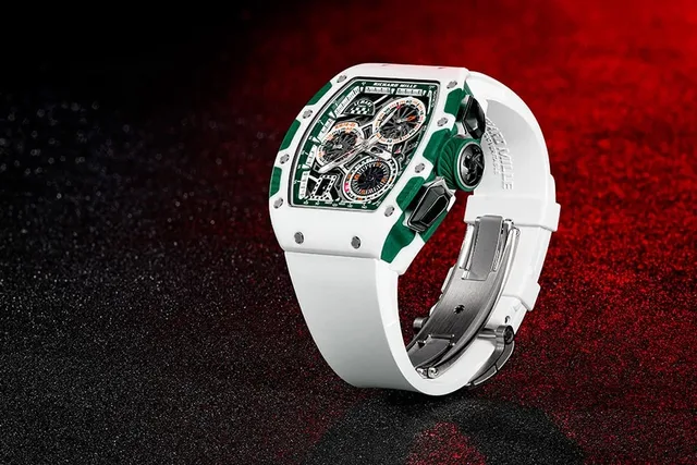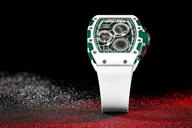 Die RM 72-01 LMC von Richard Mille zelebriert Technologie und Eleganz mit dem ersten Flyback-Chronographen des Hauses, der mit einem patentierten Kupplungs-Mechanismus mit zwei Schwingtrieben für optimale Leistung ausgestattet ist. Das neu gestaltete Automatikwerk CRMC1 mit Stunden, Minuten, kleiner Sekunde, Datum und Funktionsanzeige verfügt über eine Gangreserve von 50 Stunden. Für die Uhr wird ein Preis von ca. 350.000 Euro veranschlagt.