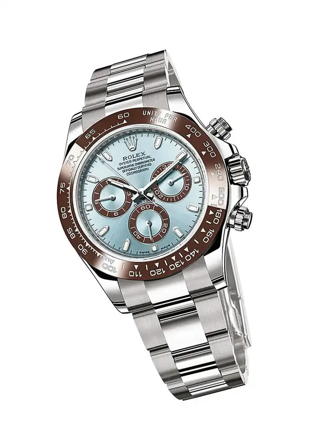 Seit 16 Jahren gibt es nun die Daytona mit Manufakturwerk, und seit elf Jahren besitzt sie die Rolex-eigene Parachrom-Bleu-Spirale. Die Preise sind hoch – junge Gebrauchtuhren in Stahl kosten nahezu so viel wie ein neues Exemplar. Die gezeigte Platinversion mit brauner Keramiklünette ist ein Jubiläumsmodell, das zum 50-jährigen Bestehen der Daytona aufgelegt wurde.nach obenInhalt