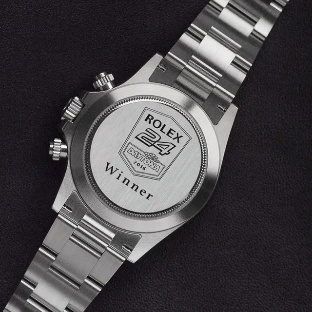 Diesen Saphirglasboden gibt es auch bei der ganz besonderen Ausführung der Oyster Perpetual Cosmograph Daytona, die Rolex dem 100-jährige Jubiläum des 24-Stunden-Rennens von Le Mans widmet. Dahinter tickt das spezielle Automatikwerk 4132, eine Modifikation des Kalibers 4131, die es ermöglicht, Zeitspannen bis zu 24 Stunden, anstatt der sonst üblichen 12 Stunden festzuhalten – eine Hommage an das 24-Stunden-Rennen von Le Mans.