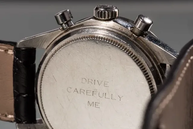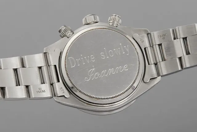 Die Rückseite der Rolex Cosmograph Daytona "Big Red" Referenz 6263 von Paul Newman trägt eine Gravur