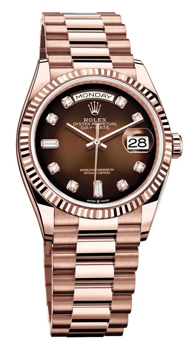 Rolex: Oyster Perpetual Day-Date 36 Everose mit braunem Ombré-Zifferblatt (40.300 Euro - Stand: Februar 2023)