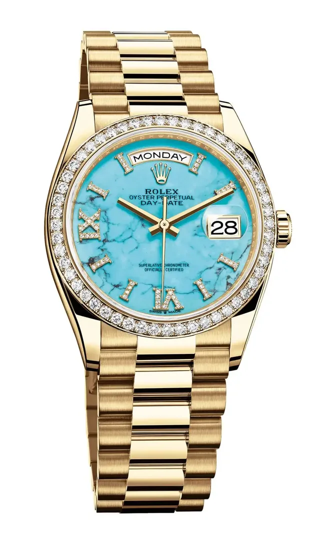 Rolex: Oyster Perpetual Day-Date 36 Gelbgold mit türkisem Zifferblatt und Diamantlünette
