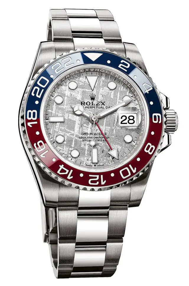 Die weißgoldene Pepsi bekommt seit 2018 zur besseren Unterscheidbarkeit vom Stahlmodell ein blaues Zifferblatt. Die kleine Rolex-Krone zwischen den Wörtern Swiss Made weist auf das neue Werk hin.Rolex GMT-Master II in Weißgold mit Meteorit-Zifferblatt und Pepsi-Lünette: