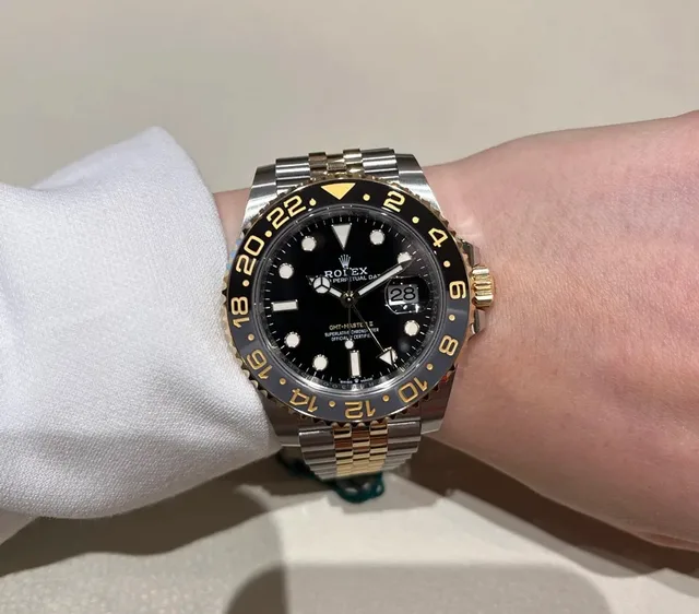 Die beidseitig drehbare Lünette ist bei der GMT-Master II charakteristisch zweifarbig. Bei den beiden neuen Referenzen zeigt sich der Gelbgold-Drehring mit einer Keramikeinlage in Schwarz-Grau. Die Graduierungen und Ziffern sind mittels eines PVD-Verfahrens mit Gelbgold belegt.Mit Energie versorgt die GMT-Master II von 2023 das hauseigene Automatikkaliber 3285 mit 70-stündiger Gangreserve, das bis zehn Bar Druck vor eindringendem Wasser geschützt ist. Das Uhrwerk bringt bei drei Uhr ein Datum auf das Zifferblatt, das unter der ikonischen Zykloplupe sitzt.