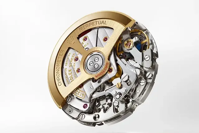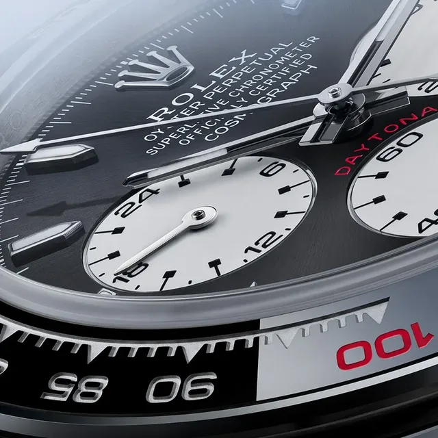 Dazu verfügt das Kaliber 4132 über eine Chronergy-Hemmung und das Paraflex-Antischocksystem. Es besticht zudem durch erweiterte Finissagen und Verzierungen, darunter Brücken mit Rolex Côtes de Genève-Verzierung – die sich von den traditionellen Côtes de Genève durch eine feine, polierte Rille zwischen den einzelnen Streifen unterscheidet. Die durchbrochene Schwungmasse aus 18 Karat Gelbgold ist mit einem optimierten Kugellager ausgestattet. Das Kaliber 4132 wird von dem automatischen Aufzugsystem Perpetual-Rotor angetrieben. Es kann dank der Konstruktion seines Federhauses und des höheren Wirkungsgrads der Hemmung mit einer Gangreserve von 72 Stunden aufwarten. Mit der Zertifizierung „Chronometer der Superlative" erfüllt die Oyster Perpetual Cosmograph Daytona den Präzisionsstandard der Marke, der bescheinigt, dass die Ganggenauigkeit bei –2 /+2 Sekunden pro Tag liegt.