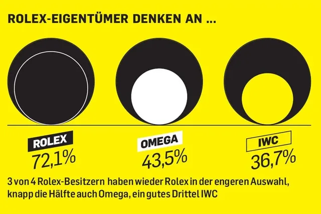 Verengt man die Frage darauf, welche Marke für den Kauf an erster Stelle steht, ist Rolex die am häufigsten genannte Marke, selbst von Omega-Besitzern. Von denen würde sich fast jeder Fünfte für eine Rolex entscheiden und jeder Siebte für Omega. Unter denen, die bereits eine Rolex haben, würde mehr als ein Drittel wieder zu Rolex greifen. Fragt man alle, steht Omega auf dem zweiten Platz – hinter Rolex.
