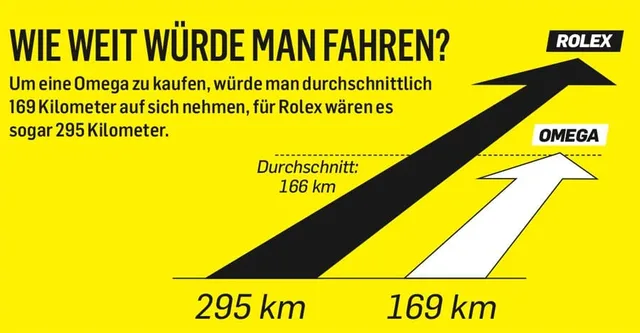 Auf der anderen Seite nehmen Rolex-Kunden größere Unannehmlichkeiten auf sich: Auf die Frage, wie weit man maximal fahren würde, um sich eine Uhr beim Konzessionär zu kaufen, wenn es keinen näher gelegenen gibt, erreicht Rolex einen Durchschnittswert von 295 Kilometern, für eine Omega würde man 169 Kilometer hinter sich bringen. Der Durchschnitt über alle Marken liegt bei 166 Kilometern.