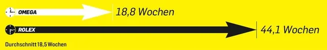Noch deutlicher ist die Differenz beim Thema Wartezeit: 44 Wochen sind Rolex-Kunden im Schnitt bereit, auf das Eintreffen der ersehnten Uhr zu warten – der zweithöchste Wert nach Patek Philippe mit 50 Wochen. Im Falle von Omega sind es knapp 19 Wochen. Damit liegt Omega knapp über dem Durchschnittswert aller Marken zusammen, der 18,5 Wochen beträgt.